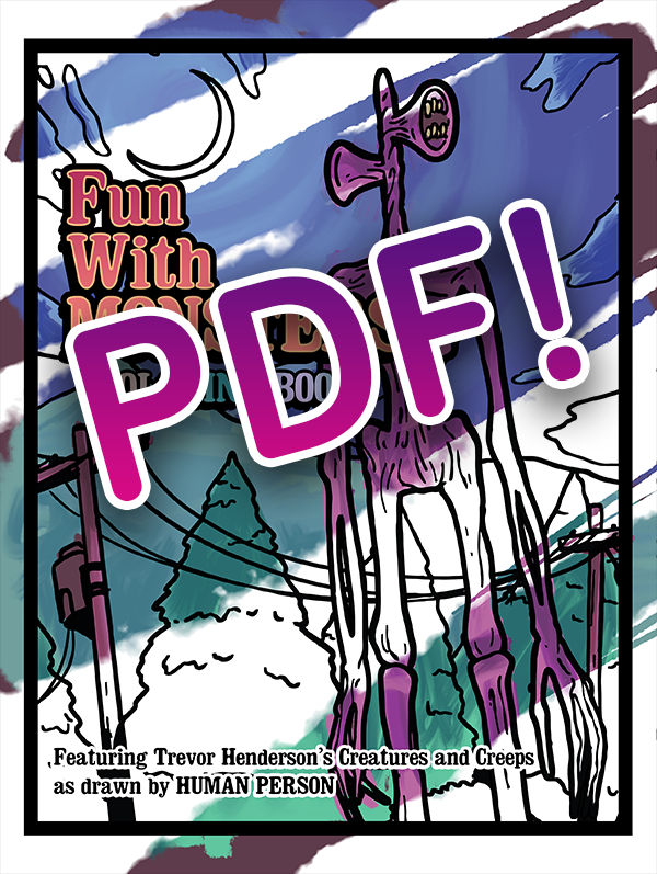 An OFFICIAL coloring book featuring monsters originally created by Slimyswampghost himself, Trevor Henderson. Lovingly rendered by Human Person. You can color them all! Siren Head! Big Charlie! Long Horse! There's 16+ original illustrations in all, and they're all waiting for you.. in the dark..